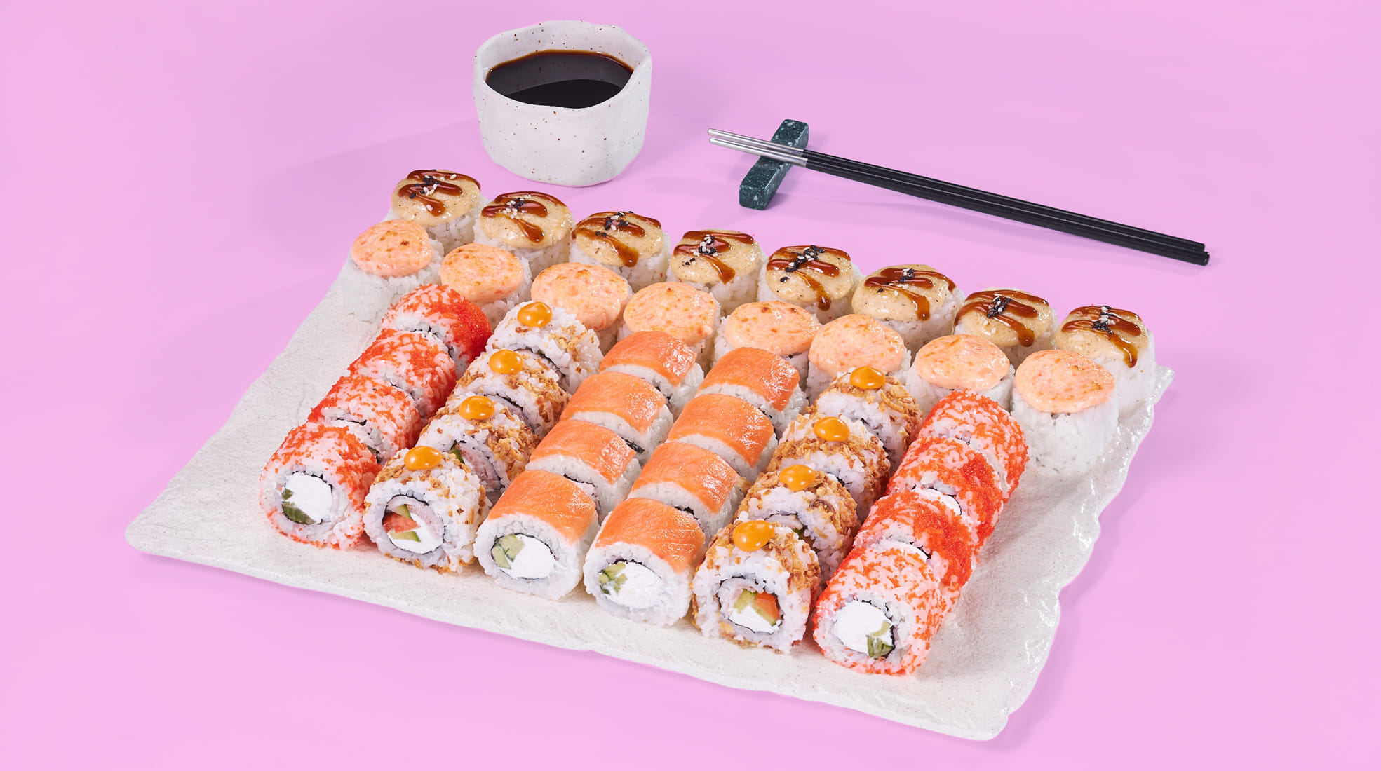 Состав: Ролл Филадельфия лайт с огурцом (8 шт.), Ролл Бао (8 шт.), Царевна ролл (8 шт.), Ролл Мураками (8 шт.), Ролл Кадзуко (8 шт.) *Не забудьте заказать имбирь, васаби и соевый соус. Они не входят в стоимость заказа. *Внешний вид блюда может отличаться от фото на сайте.